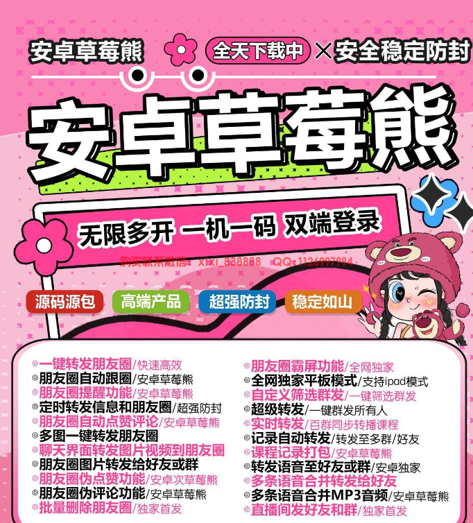 草莓熊是一款专为安卓和鸿蒙系统设计的多功能微信分身软件:http://cmx.jxl66.asia。它不仅支持微信多开,还具备一键转发朋友圈、虚拟定位、消息防撤